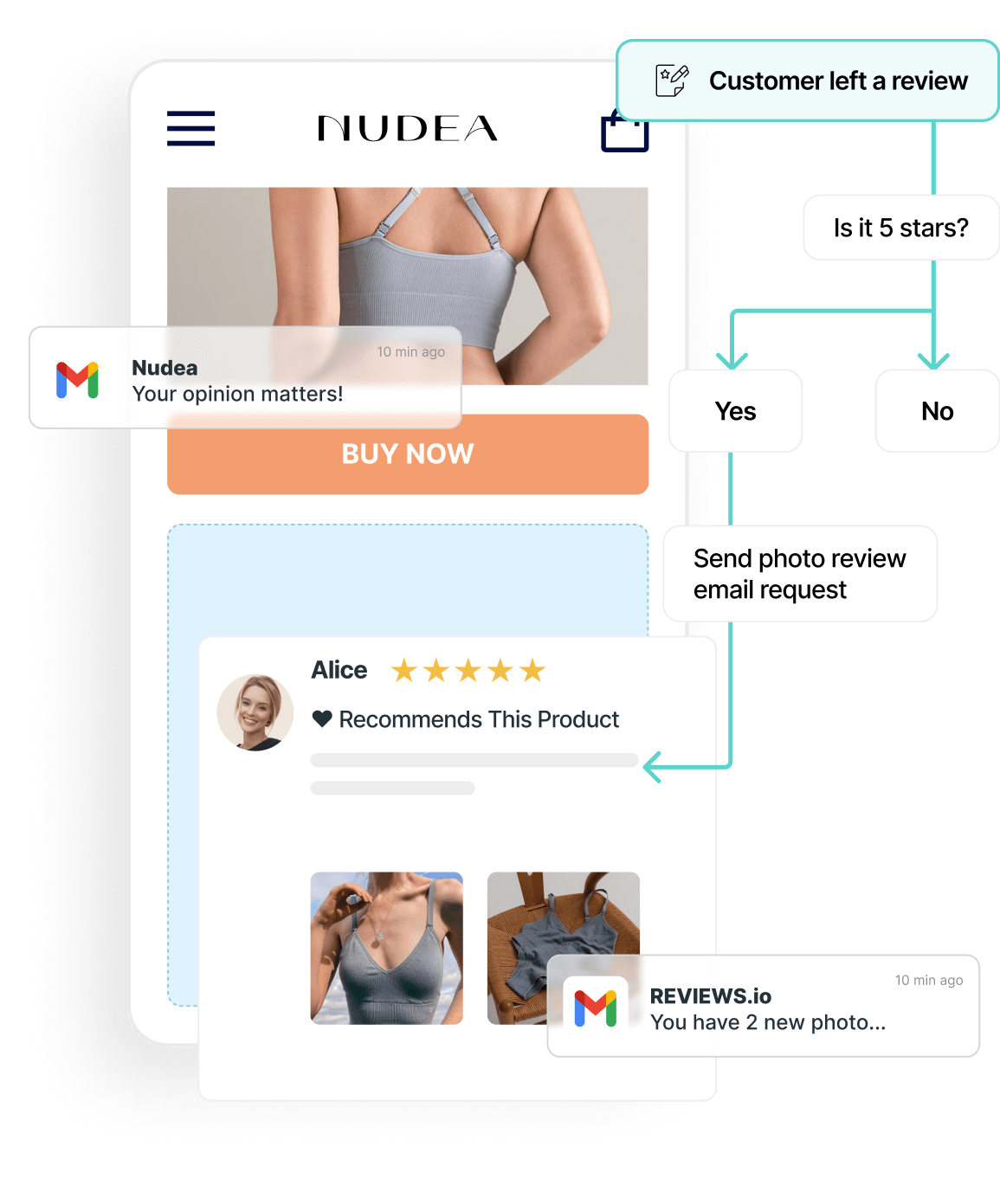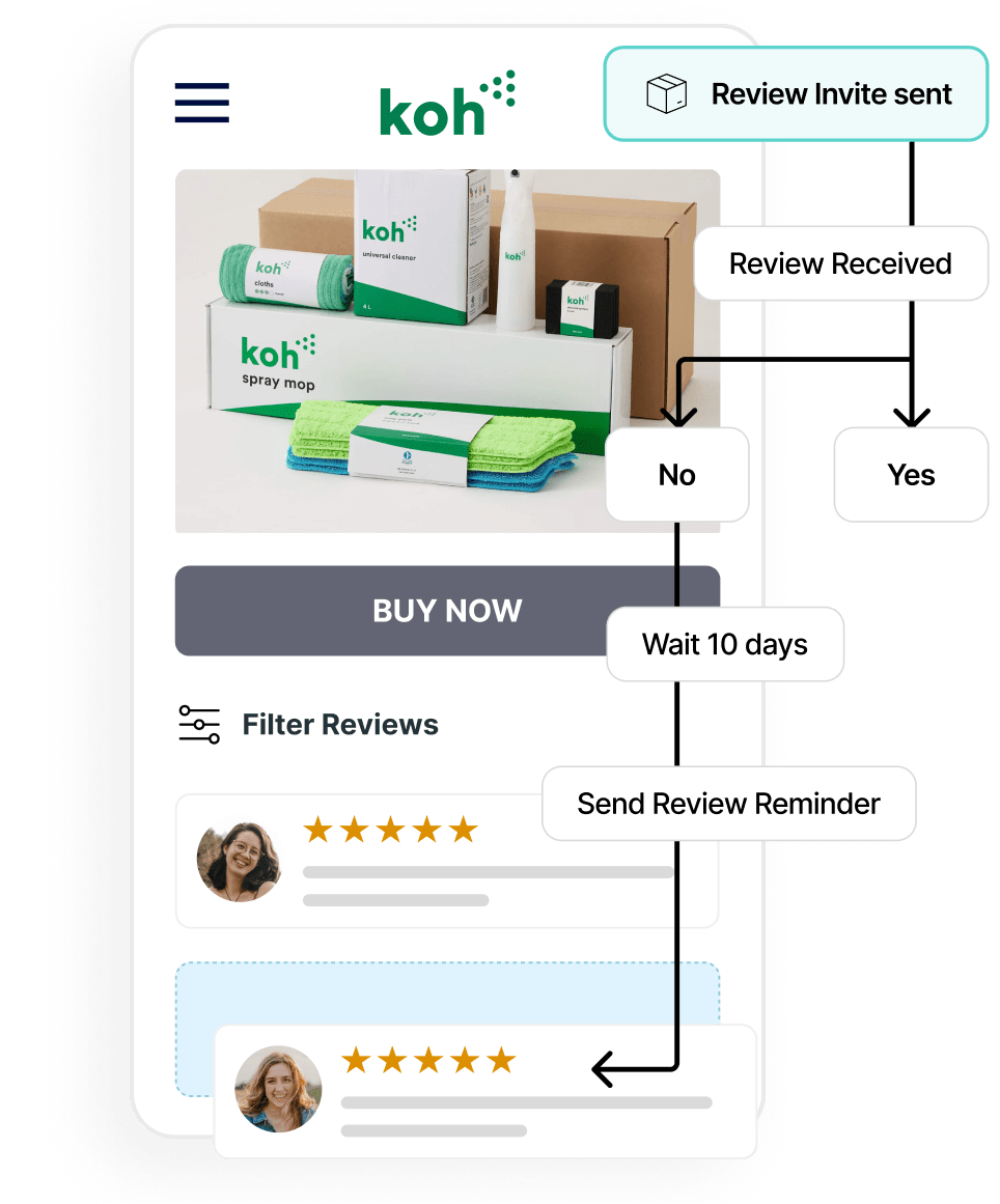 Automate follow-up communications based on user actions. For example, you can send reminder emails to users who haven't responded or ask for photos or videos from those who have left a positive 5-star review.